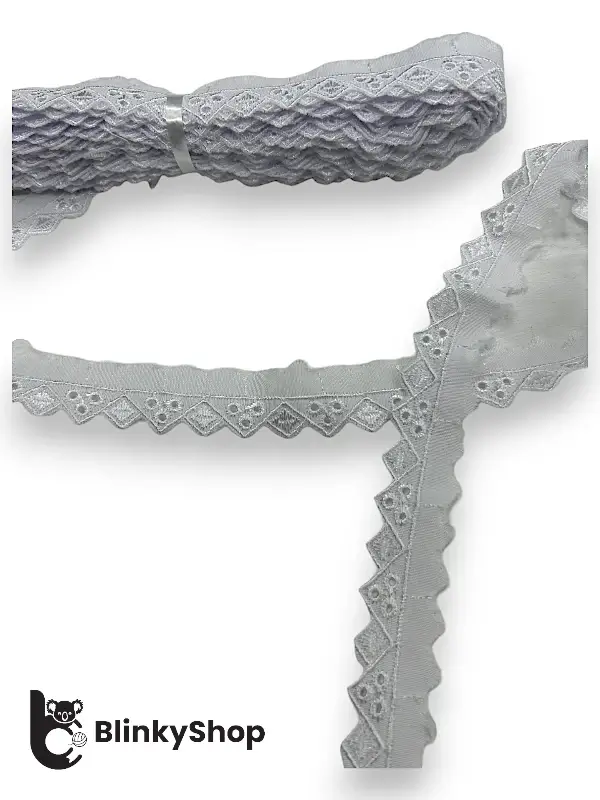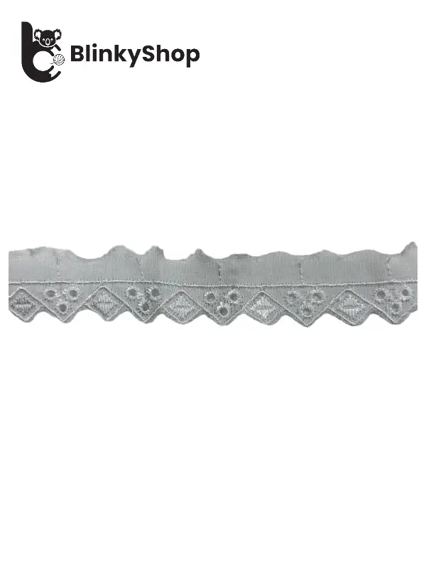 Broderie pe pânză albă cu design în stil clasic, cu onduleuri, șir de motive geometrice și margine festonată. Ideal pentru a fi utilizată în diverse aplicații, de la îmbrăcăminte festivă până la accesorii și decorațiuni interioare.