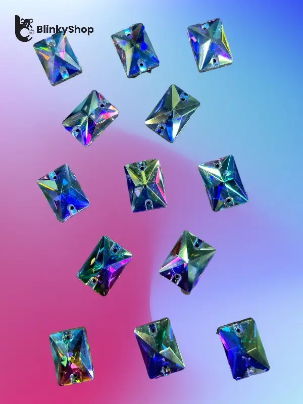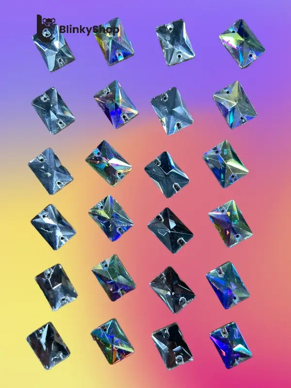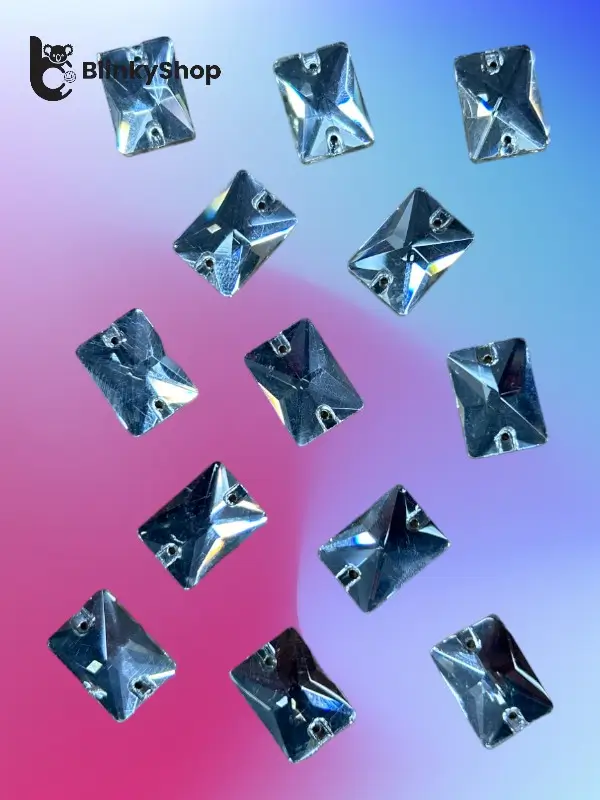 Cristalele de cusut dreptunghiulare din sticlă, sunt ideale pentru decorarea hainelor dar și pentru accesorii și proiecte de artizanat. Dimensiunea lor este de 13mm pe 18mm. Sunt prevăzute cu găuri laterale, facilitând aplicarea prin coasere pe orice tip de material. Se pot cumpăran minim 20 bucăti.