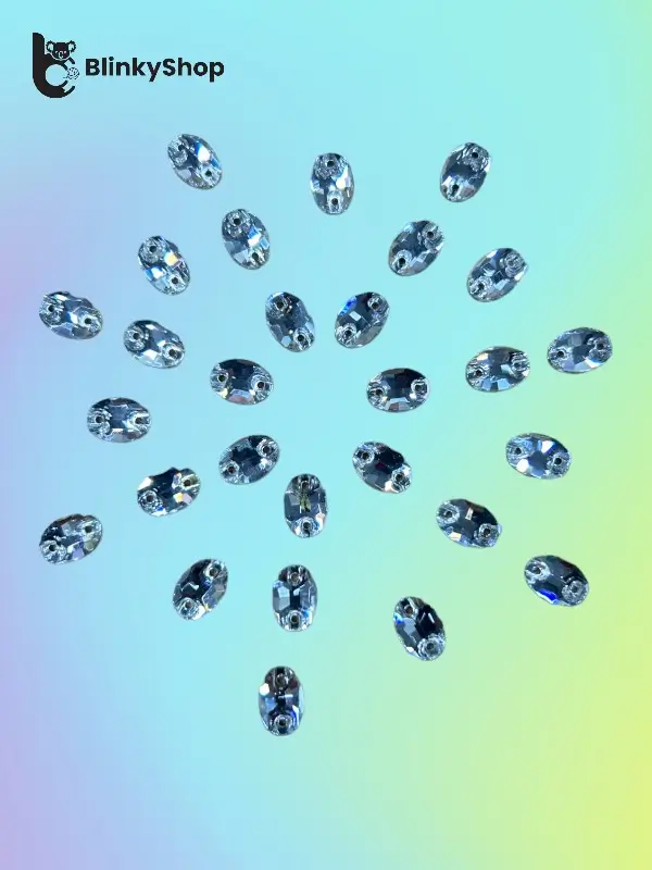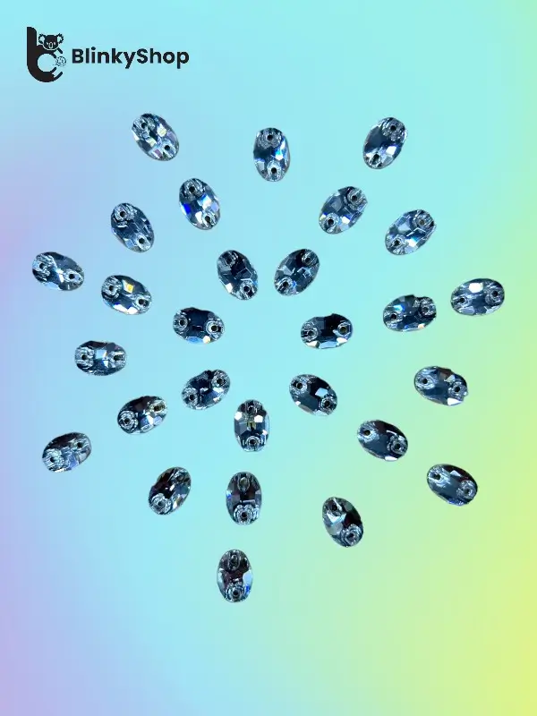 Cristalele de cusut ovale din sticlă, sunt ideale pentru decorarea hainelor dar și pentru accesorii și proiecte de artizanat. Dimensiunea lor este de 6mm pe 10 mm. Sunt prevăzute cu găuri laterale, facilitând aplicarea prin coasere pe orice tip de material. Se pot cumpăra minim 20 bucăti.