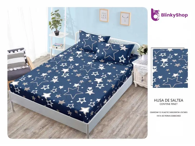 Husa de pat din finet cu imprimeu stele, compusa din 3 piese, cearceaf finet cu elastic + 2 fete de perna, potrivit pentru orice dormitor.