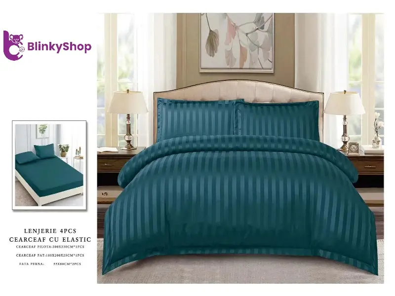 Lenjerie de pat Horeca din damasc, 4 piese, cearceaf de pat cu elastic potrivit atat in industria hoteliera, cat si pentru uz casnic. Culoare verde smarald cu dungi. Producător: Primavara
