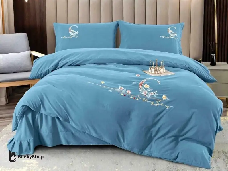 Lenjerie de lux brodata, din finet tip catifea 4 piese, cearceaf de pat cu volanase, potrivit pentru orice dormitor.Culoare: turcuaz.