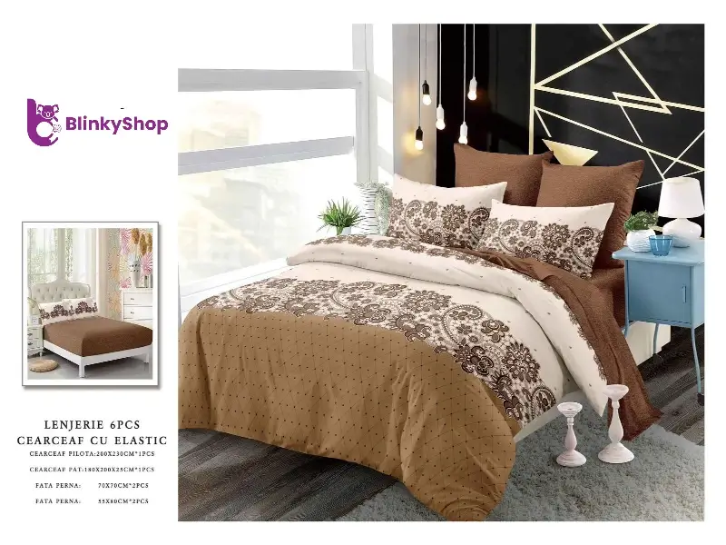 Lenjerie de pat bumbac finet, cu doua fețe una bej cu flori maro, cealaltă maro uni, din 6 piese cu cearceaf normal pentru pat dublu. Dimensiuni lenjerie pat 235 x 250 cm.