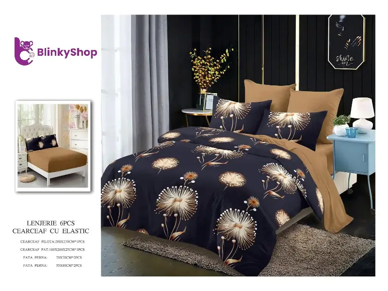 Lenjerie de pat bumbac finet, cu doua fețe una negru cu papadi in nuante de maro, cealaltă maro uni, din 6 piese cu cearceaf normal pentru pat dublu. Dimensiuni lenjerie pat 235 x 250 cm.