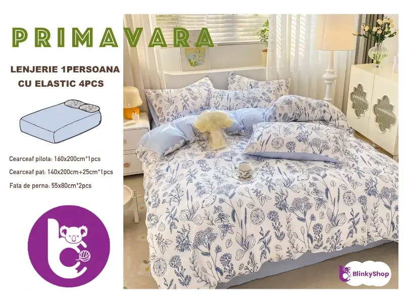 Lenjerie de pat din finet creponat, din 4 piese, cearceaf finet cu elastic potrivit pentru paturi de 140 x 200 cm. Imprimeu floricele. Producător: Primavara