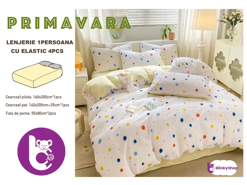 Lenjerie de pat din finet creponat, din 4 piese, cearceaf finet cu elastic potrivit pentru paturi de 140 x 200 cm. Imprimeu floricele. Producător: Primavara