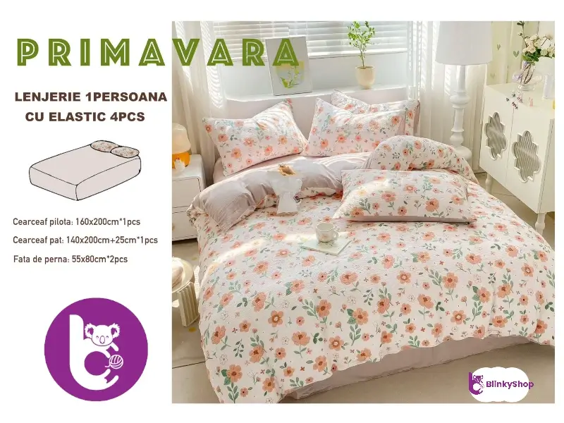 Lenjerie de pat din finet creponat, din 4 piese, cearceaf finet cu elastic potrivit pentru paturi de 140 x 200 cm. Imprimeu floricele. Producător: Primavara