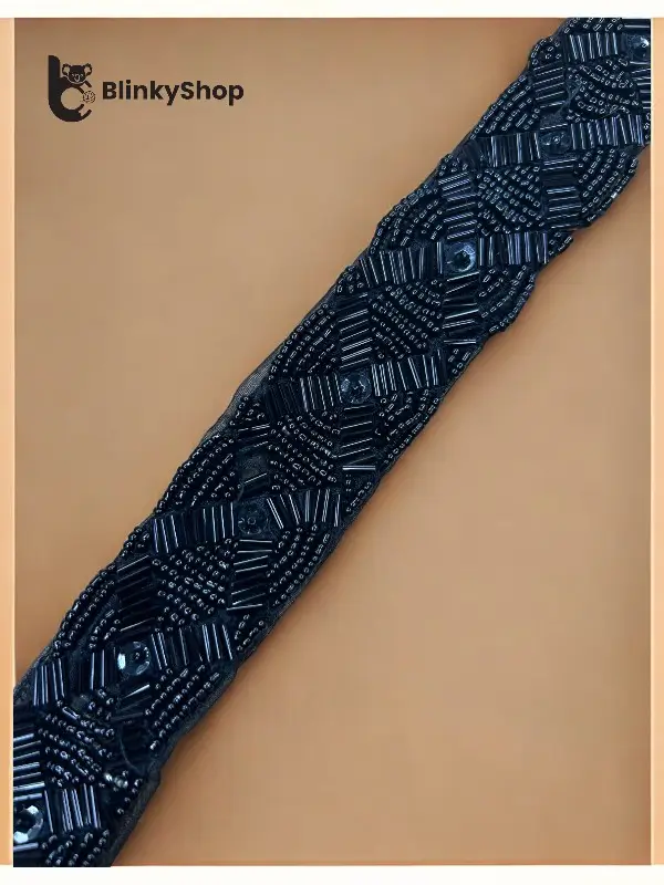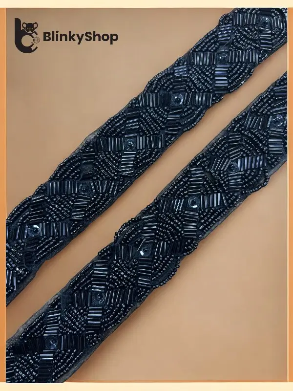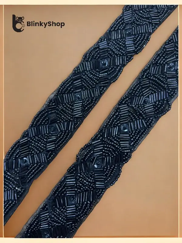 Pasmanteria decorativă bandă Midnight este realizată pe o bază de tiul negru, decorată cu mărgeluțe tubulare și rotunde dispuse într-un model geometric complex. Aceasta include secțiuni de mărgeluțe tubulare dispuse în forme rectangulare și mărgeluțe rotunde plasate strategic pentru a crea un design elegant. Este concepută pentru a fi aplicată prin coasere pe diverse materiale, fiind potrivită pentru haine și accesorii, cum ar fi rochiile sau gențile.