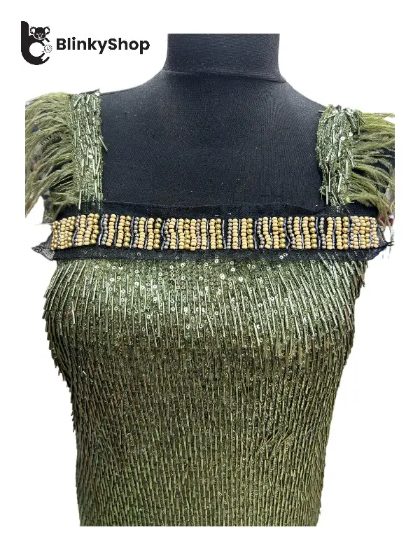 Pasmanteria decorativă este realizată pe o bază de tiul negru, decorată cu mărgeluțe în nuanțe de bej, auriu și negru. Este concepută pentru a fi aplicată prin coasere pe diverse materiale, fiind potrivită pentru haine și accesorii, cum ar fi gențile.